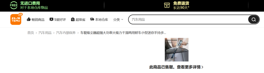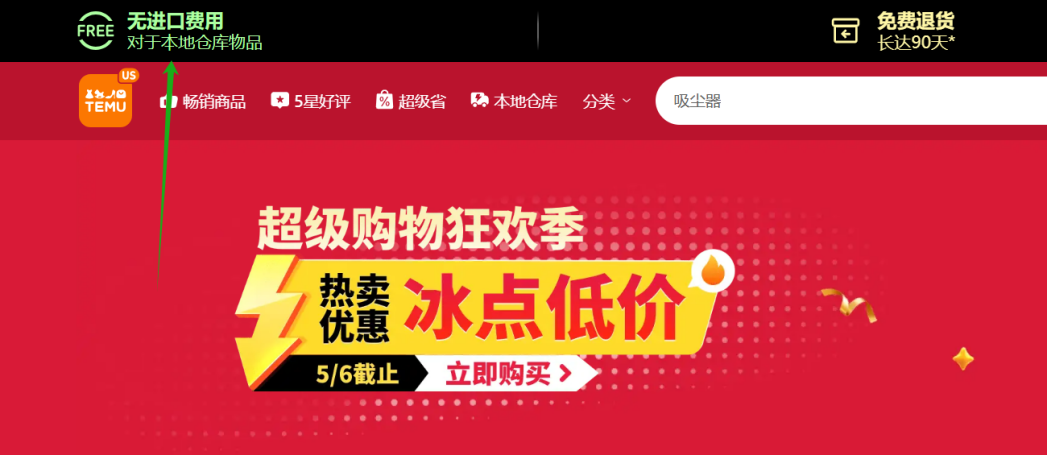 为了推广其本地仓发货的商品,Temu在其首页和商品页面顶部,挂了一个醒目的提示“本地仓商品,无进口费”。