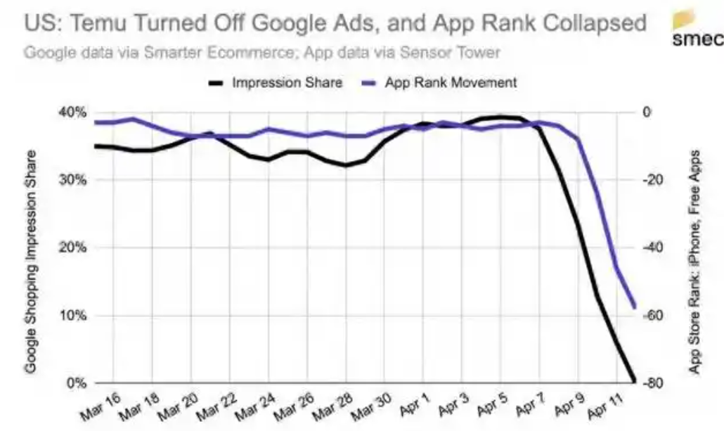 市场营销公司Smarter Ecommerce主管Mike Ryan称,Temu在4月9日开始关闭所有的美国Google Shopping广告,而另据营销绩效机构Tinuiti 的数据,Temu在美国谷歌购物广告曝光量中的份额,从3月31日的19%下降到4月9日的10%,再到4月12日降至0%。