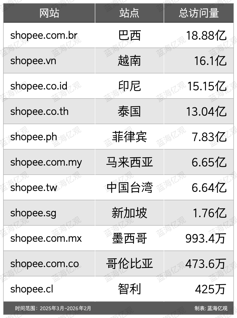 近一年(2025年3月-2026年2月),Shopee在全球多个站点(PC+移动端)合计的总访问量约67亿。其中,仅东南亚6个站点的总访问量就达41.65亿。