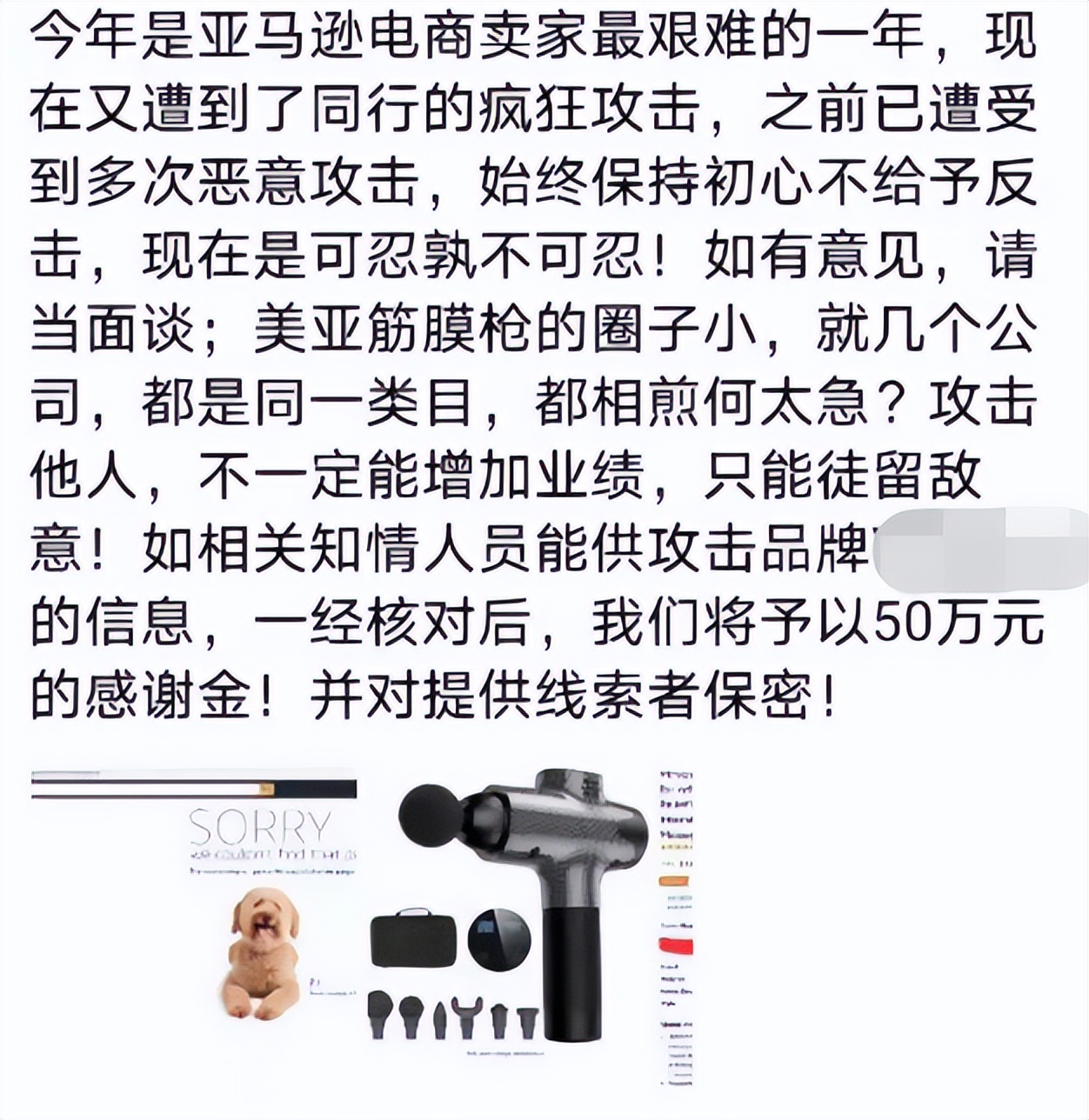 在此之前,在筋膜枪类目也发生了类似的事件。该卖家也发出了“悬赏令”,拿出50万元,期望可以收集到攻击者的信息。