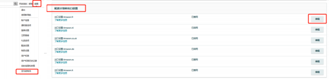 如果你是FBA卖家,要确认该功能是否已经正确开启。可通过【卖家平台】-【设置】-【亚马逊物流】-【配送计划和出口设置】-【编辑】进行操作。