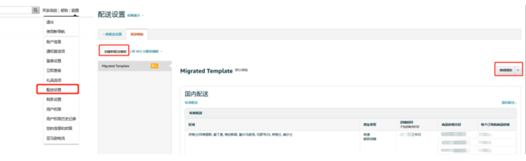1. 【卖家平台】-【设置】-【配送设置】-点击【创建新配送模板】