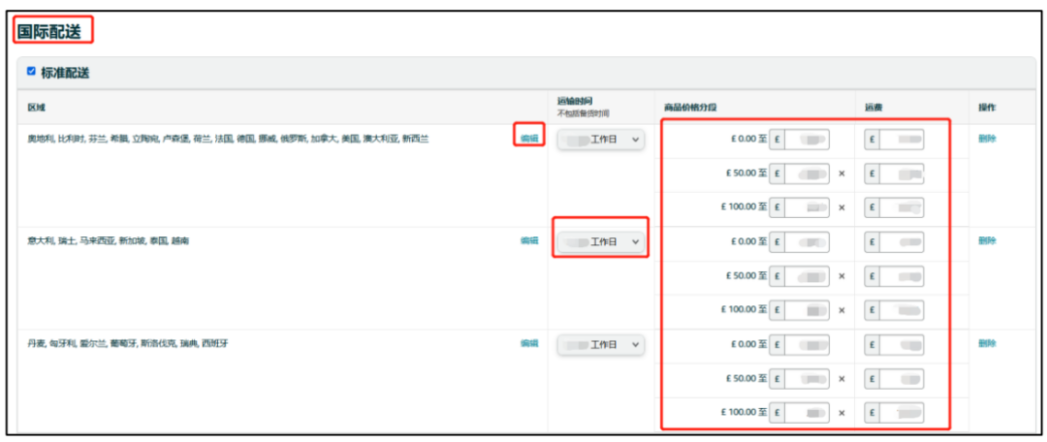 2. 在【国际配送】下,为“标准配送”和“加急配送”选择运输时间和运费,为目的地国家创建新的配送模板,点击【保存】