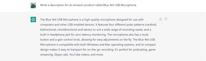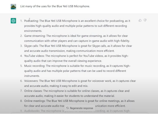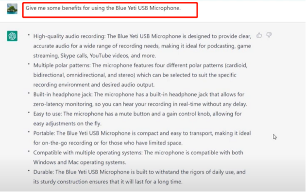 比如,我们针对一个USB麦克风,我们可以请它写“description”,然后让它写出“卖点”,再写出的“应用场景”,等等。