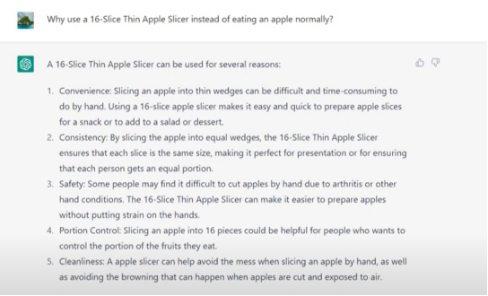 比如,我们卖一款水果切割器,ChatGPT可以非常体贴了写出了“可以让每个吃苹果的人分到相等的一块”。