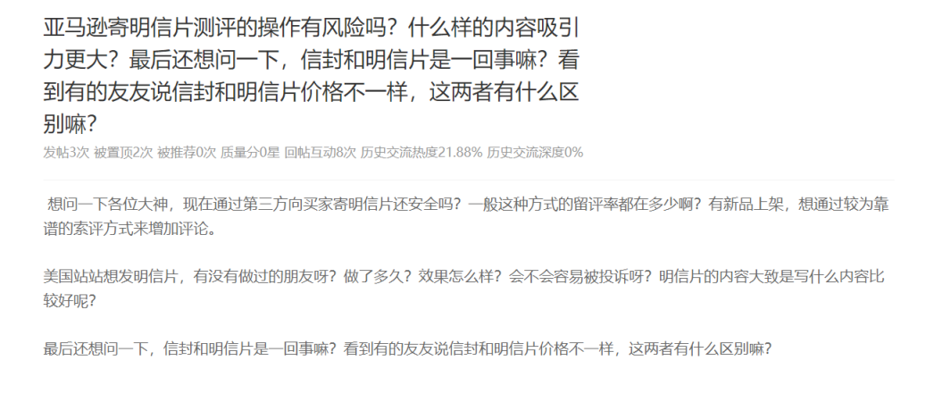 然而,在2022年年末开始,又有一批卖家开始按捺不住了,在知无不言等论坛探讨“亚马逊寄明信片测评有风险吗”“信封与明信片是一回事吗?”等话题。