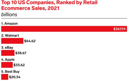 eMarketer的一份2021年数据显示,亚马逊以3672亿美元位居第一,沃尔玛则以646亿美元,位居第二,两者之间相差6倍。