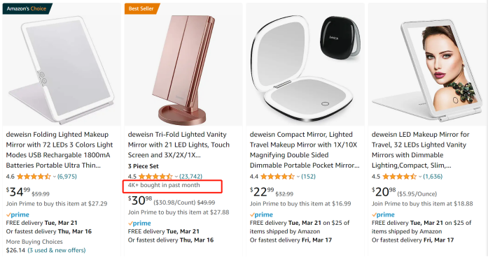 如下图,一款Bestseller的镜子显示,上个月销量为4000+(4k+ bought in past month)。 这一信息,不仅在电脑桌面端有显示,同时也在手机等移动端显示。