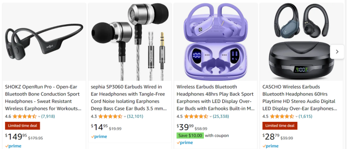 我们搜索“ear bud”等关键词,发现耳机类目的listing,几乎没有显示销量。