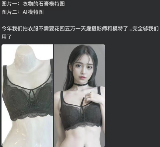 比如,这张流传甚广的图,给出衣物的石膏模特图,将其“投喂”给AI工具之后,它可以生成了令人亮眼的“真人模特试穿图”。