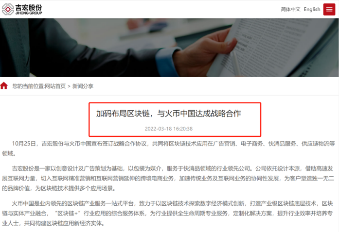 图/吉宏股份官网关于公司布局区块链的通告