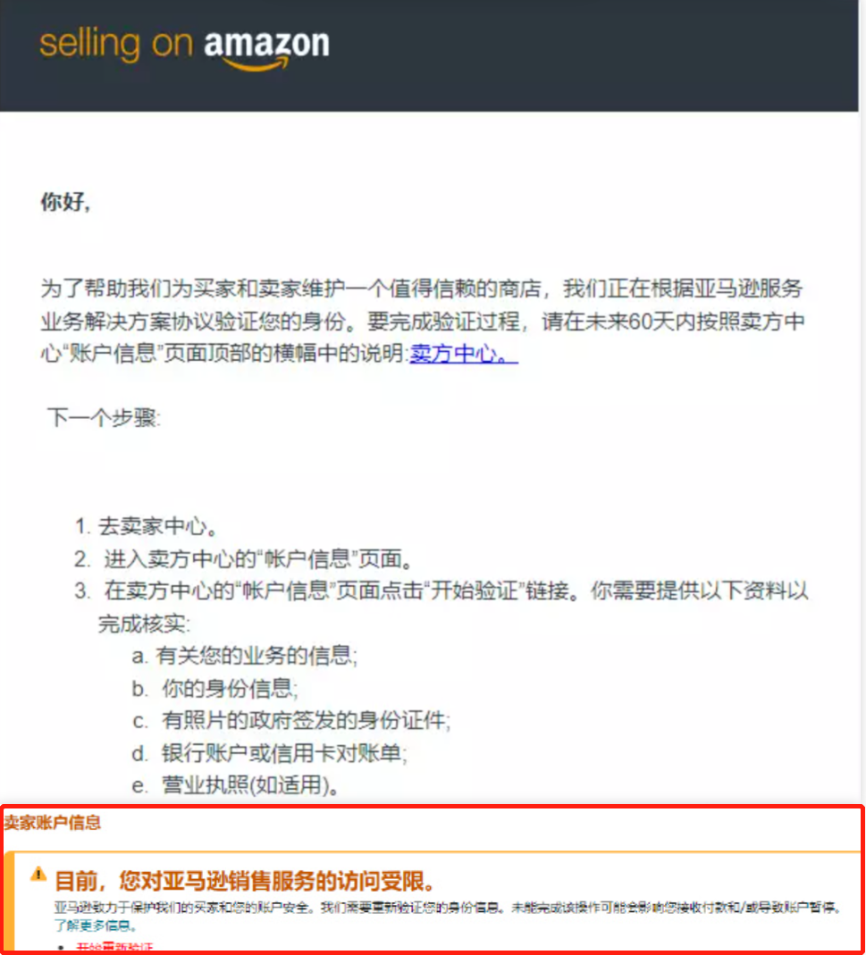 这表面上是一封提醒卖家验证身份信息的邮件,但收到该通知的卖家“对亚马逊销售服务的访问”已受限。