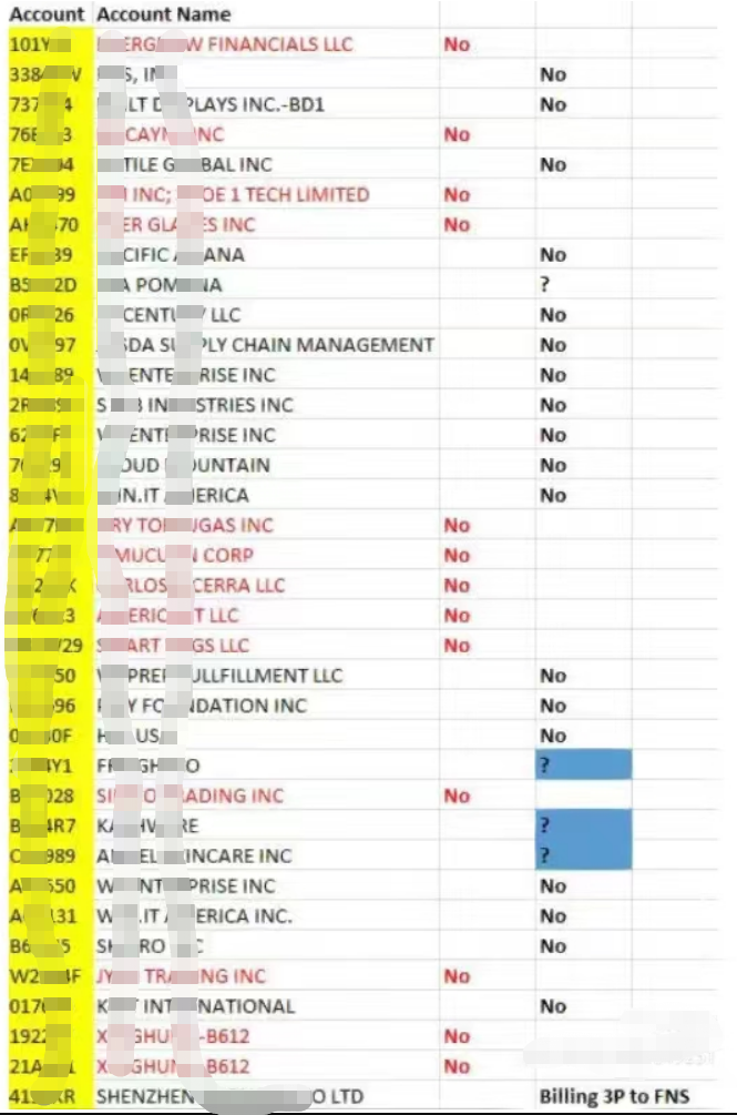 在该名单上,有标注黑色的,也有标注红色。红色编号为跑水账号,货件会被UPS没收。黑色编号为偷重、偷区账号,为UPS重点监控账号。