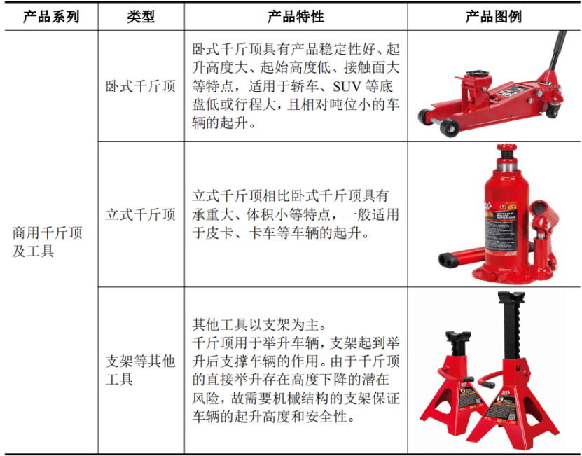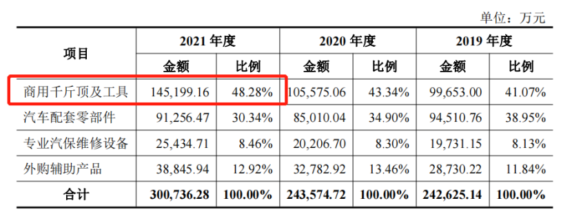 这家公司就是做汽配细分品类的常熟通润汽车配件公司,产品以千斤顶为主。2021年,其商用千斤顶及工具的收入占比几乎占了半壁江山(48.28%,)。