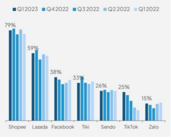 今年一季度,TikTok的渗透率已超过25%,GMV超过2.5亿美元,占同期越南电商GMV的15.5%,不断逼近Shopee 63.1%、Lazada 19.1%的市场份额。