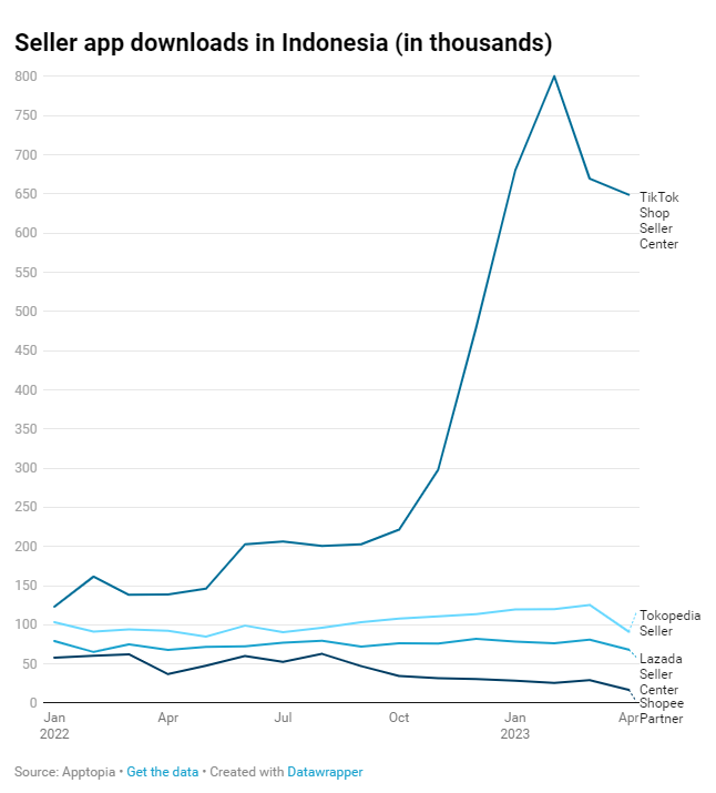 根据Apptopia 的数据,TikTok Shop Seller Center的卖家端App在印尼的下载量出现了几何级增长,尤其是在2023年2月达到了一个峰值。
