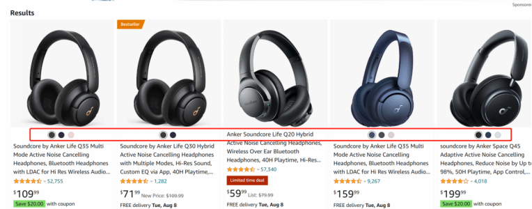 比如,在加拿大站点搜索Anker Q30,可以看到以颜色为变体的多变体产品下方多出了颜色贴,这样对于买家来说更加直观了。