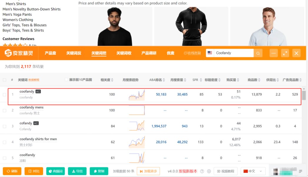 以赛维服饰品牌“Coofandy”为例。据卖家精灵www.sellersprite.com数据显示,在亚马逊北美站上,“Coofandy”的月搜索量达到30485,此外,“通用词+品牌词(Coofandy shirt for men)”的搜索量更是达到了48292。