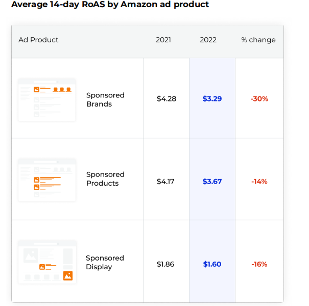 2021年SP广告的RoAS为4.17美元,意味着每投放1美元广告,卖家能得到4.17美元的收入。但是在2022年,这个数额变为了3.67美元,下降了0.5美元。 假设卖家每年投入2000美元在SP广告,2021年他们的广告销售额可达到8340美元,但是2022年,卖家花同样的钱只能赚7340美元,少了1000美元。 图/JungleScout