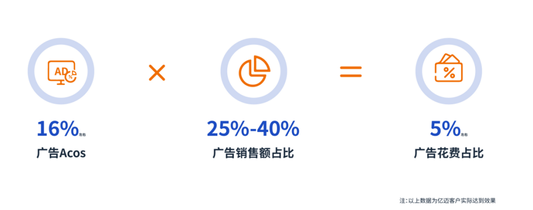 通过反复测试和经营,亿迈的AI广告系统可以把握广告投放整体指标,有效提升转化率。 当客户接入系统3个月后,Acos基本稳定在16%,广告花费仅为5%左右。从而改善效益,广告销售额占比达25%-40%。