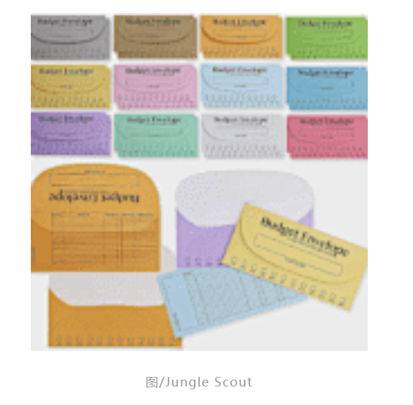 结语 今年1月份亚马逊热销第一,不是户外用品,而是一套信封,它分为12种颜色,刚好对应全年12个月,作用是规划一整年的财务支出,帮助控制预算。 据JungleScout的统计,这套名为预算信封的产品销售额增长了224%,同时用户对“预算计划和月度账单管理”的搜索量上升了170%。 图/Jungle Scout
