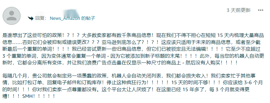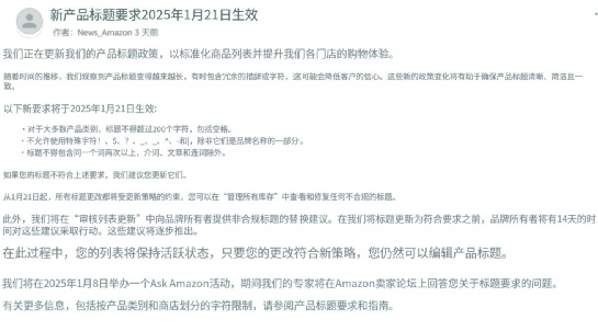 近日,亚马逊发布了一条Listing标题规范的新规,要求卖家在14天内,对不规范的描述进行修改,以提升产品展示的质量和买家的购物体验。新规将从1月21日生效,所有商品名称的更改,都要遵守更新后的规则,卖家可以在“管理所有库存”中查看和修改不符合要求的商品名称。亚马逊此举引发了卖家的讨论和担忧,不少卖家认为这一新规大大增加了他们的运营压力。